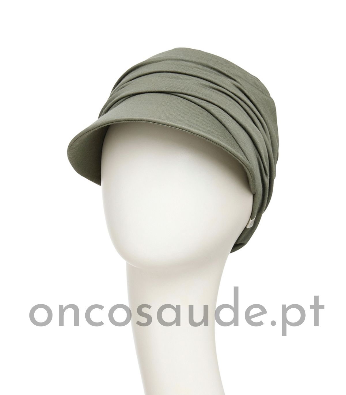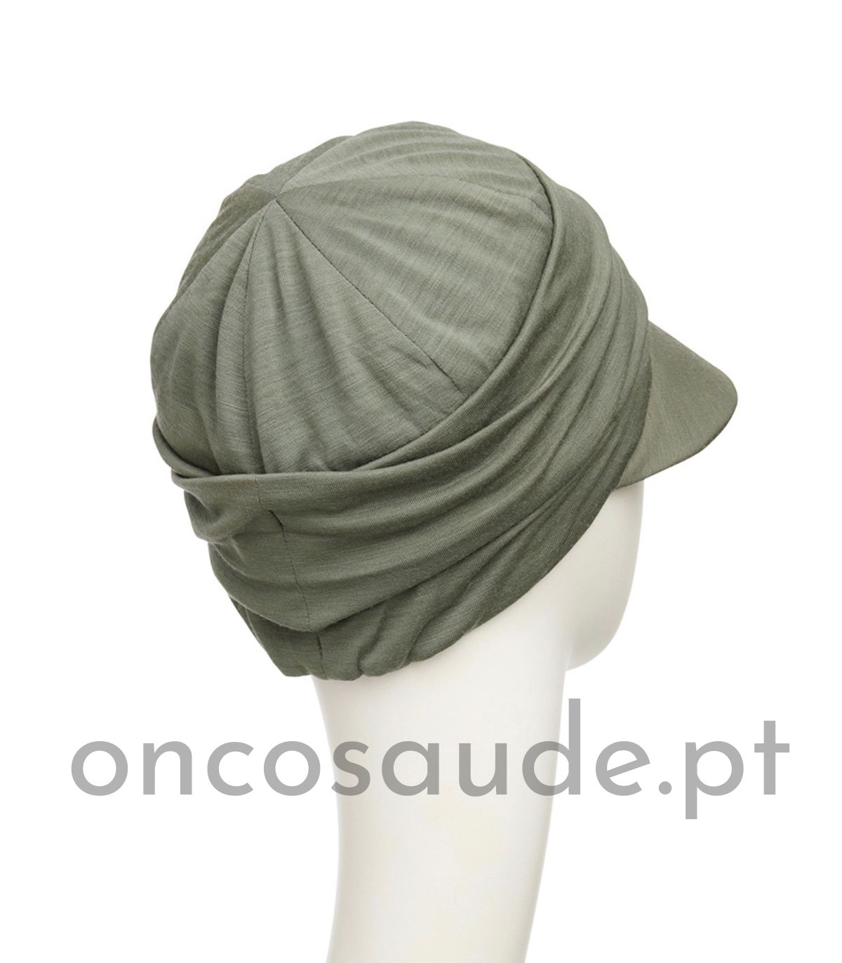 O chapéu oncológico Bella apresenta um design único que permite um ajuste perfeito à cabeça, destacando-se pela sua elegância e facilidade de colocação.