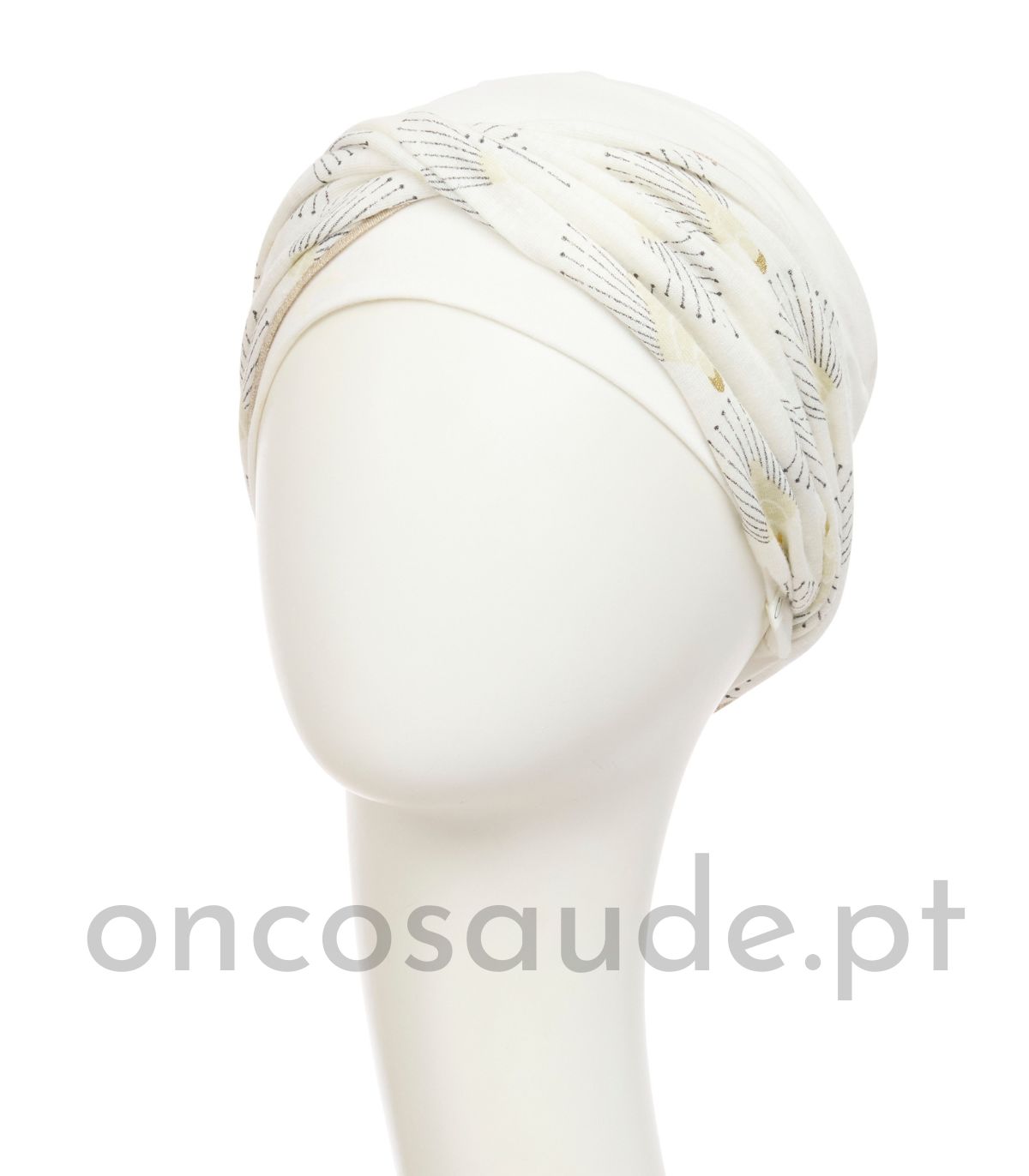 O turbante apresenta um design único que permite um ajuste perfeito à cabeça, garantindo a sua estabilidade ao longo do dia.