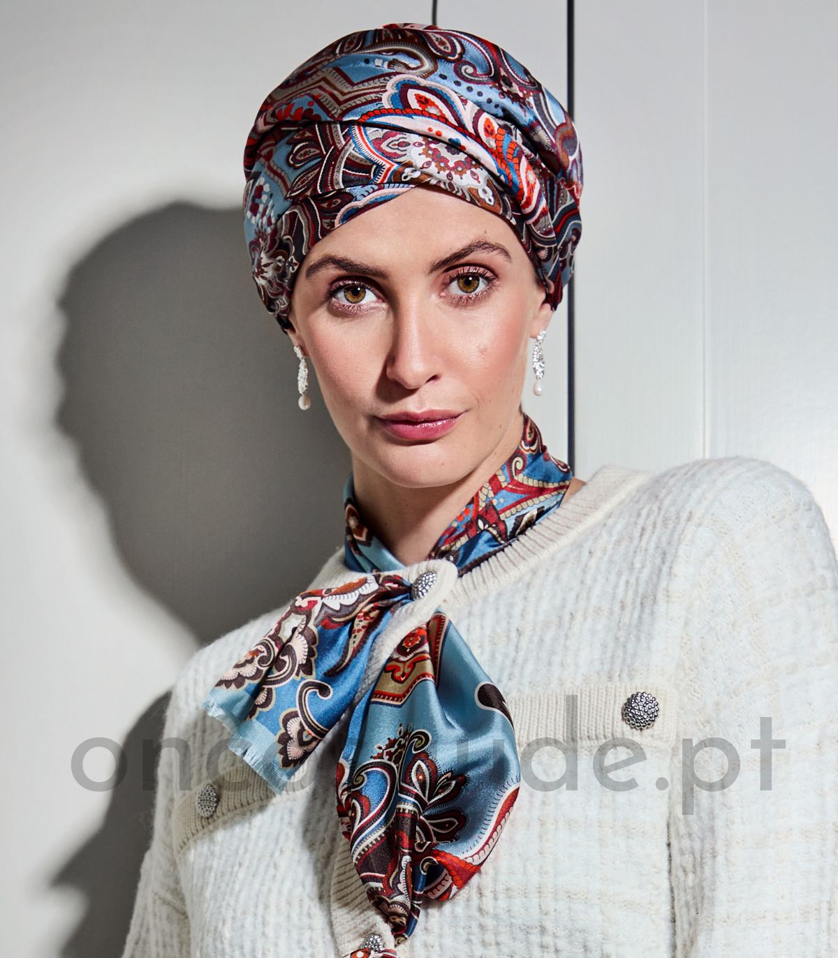 O turbante oncológico Luna destaca-se pela sua elegância e facilidade de colocação.