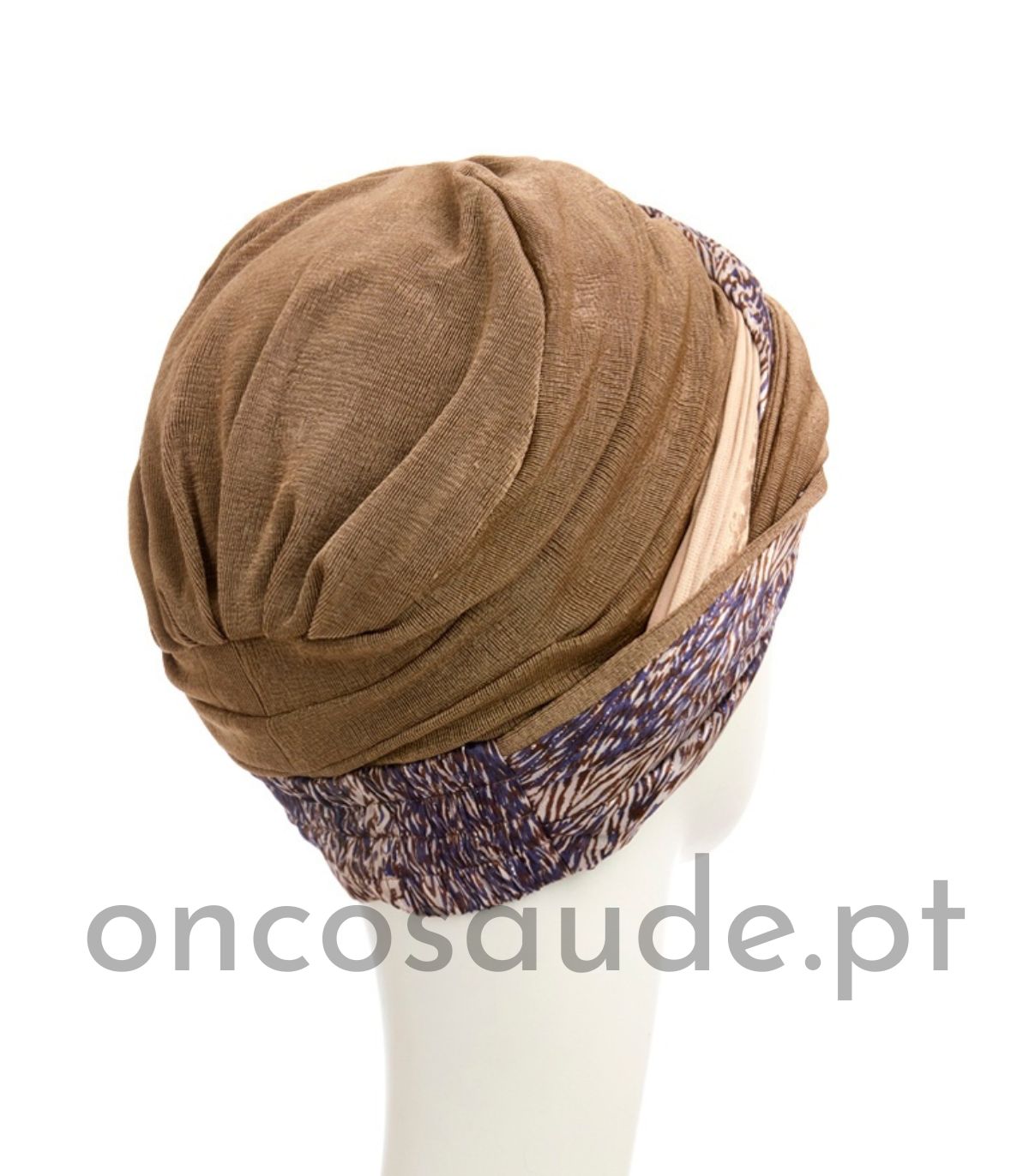 O turbante Mila apresenta um design único que permite um ajuste perfeito à cabeça, garantindo a sua estabilidade ao longo do dia.
